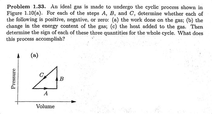 U 5PV2 C For an ideal gas. An ideal gas is made to undergo the cyclic process shown in Figure 110 a. An ideal gas is made to undergo the cyclic process shown in Figure 110mathrma For each of the steps A B and C determine whether each of the following is positive negative or zero.